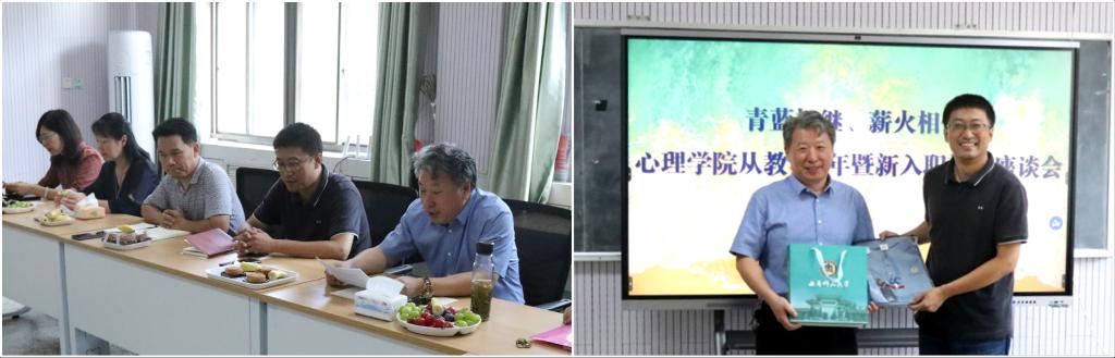 领导交流入职以来的工作生活经历。思及初来学院时各位领导的热切关怀和老师们的耐心帮助,各位新教师对学院表示由衷的感谢。袁光杰提及,自己入职一年内就能申请到国家级项目,离不开学院的优良平台和老师们的大力支持,未来要继续和学院一起在科研的道路上不断耕耘。钱虹表示,自己在入职时恰逢疫情防控和新生入学的关键时期,没有学院各位领导老师的热情帮助就没有工作的顺利进行。韩含、杜雅楠、逄文斌都提到,学院非常关注新入职教师的适应和过渡帮扶,为顺利的进入教师角色奠定坚实的基础。交流过后,院长何文广代表学院为各位新入职教师送上礼物,祝愿大家工作顺利,前程似锦。