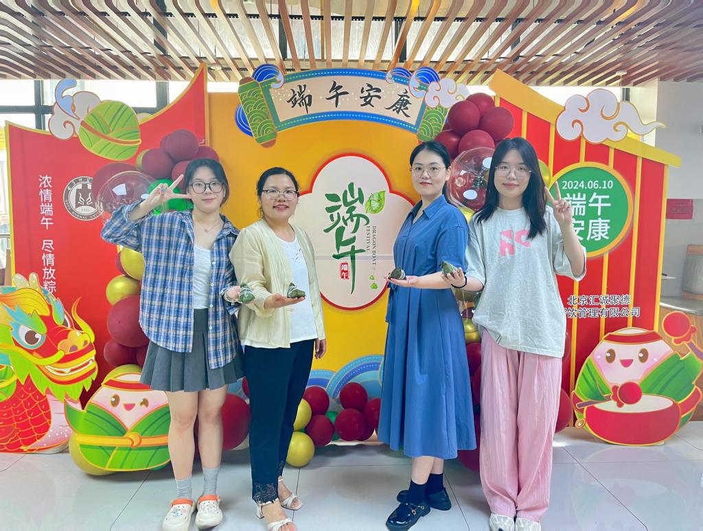 本次活动在齐风餐厅拉开帷幕,装饰一新的场地中挂满了五彩斑斓的粽子和龙舟纸样装饰,空气中弥漫着粽叶与糯米的香气,洋溢着浓厚的传统节日氛围。师生们围立成圈,面前摆放着事先准备好的糯米、红枣、粽叶等材料。师生齐心协作,一边尝试如何折粽叶、填米、放馅料、绑绳,一边交流着端午节的历史故事和各地不同的粽子风味,在实践中感受中华传统文化的魅力。如火如荼的劳动氛围吸引了留学生参与其中,在中外师生的共同努力下,留学生们第一次尝试包起了粽子。虽然开始时有些手忙脚乱,但在大家的鼓励和耐心帮助下,他们逐渐掌握了技巧,脸上洋溢着成就感的笑容。这一环节不仅增进了国际学生对中国传统文化的理解和喜爱,也加深了中外师生之间的友谊,展现了开放包容的校园氛围。