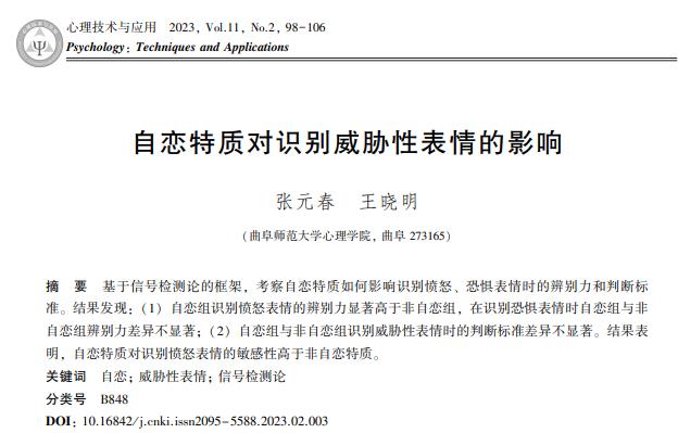 张元春, 王晓明. (2023). 自恋特质对识别威胁性表情的影响. 心理技术与应用, 11(2), 98-106. doi:10.16842/j.cnki.issn2095-5588.2023.02.003.
