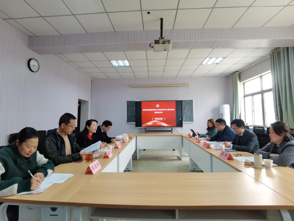李海青首先对王晓刚一行的到来表示热烈欢迎,并就学院的发展历史、学科建设、本科生人才培养、师范专业认证、“四零”课堂、教学督导、师范生专业能力提升等方面做了详细介绍。王晓刚对我院的工作经验分享表示感谢,并对西南民族大学教育学与心理学学院的基本情况、专业特色、人才培养方案等作了简要介绍。随后,双方围绕心理学专业考研率的提升、师范生教育教学能力考核、见习实习等实践类课程的设置、本科生导师“两段制”、过程性考核工作量的计算、专题研讨课程的设置等方面进行了深入交流。