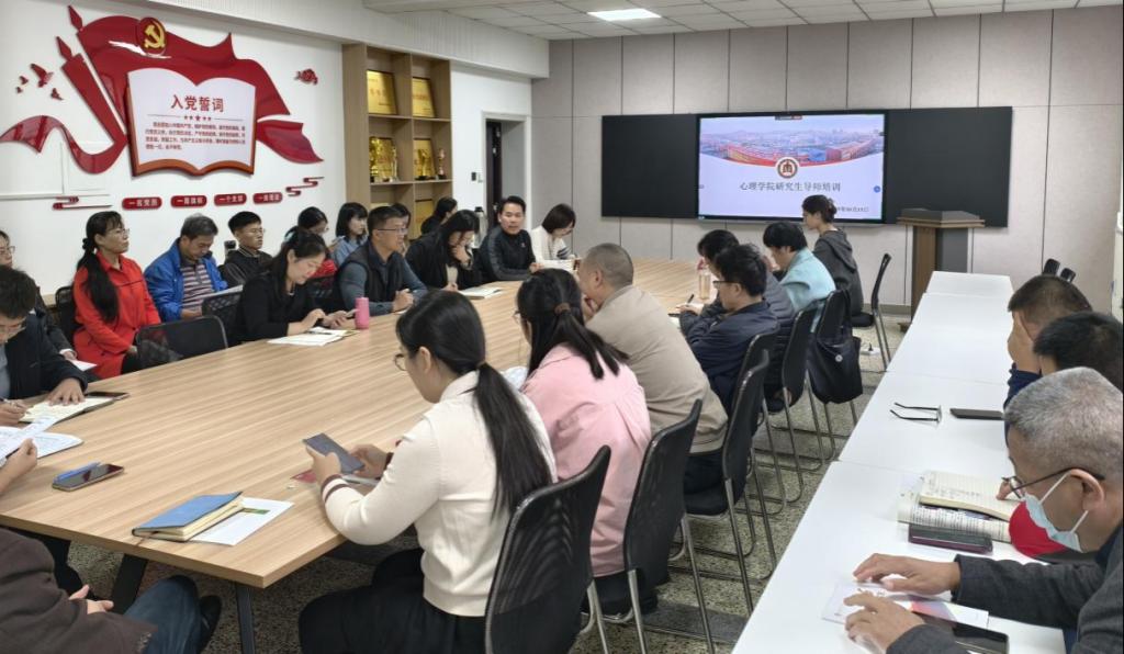 院长何文广主持,研究生处副处长黄美玲、职业与继续教育研究院院长何爱霞教授主讲,全体研究生导师参与。