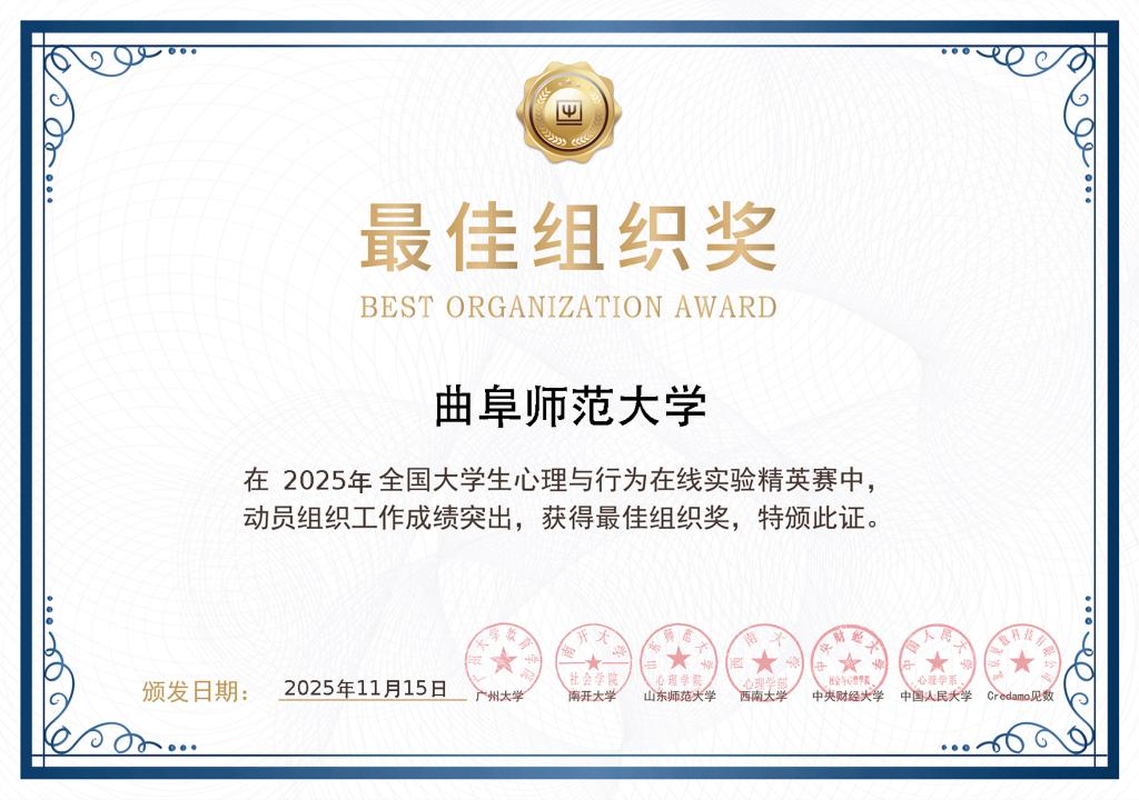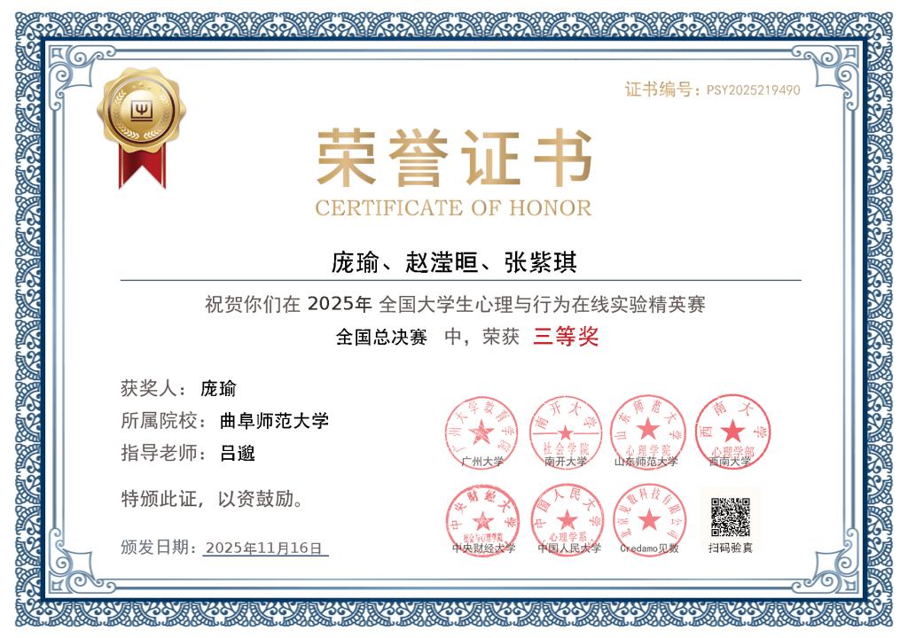 PODO漫画 讯通讯员:胡晓涵2025年11月15日,第三届全国大学生心理与行为在线实验精英赛总决赛在中央财经大学成功举办。我院三支队伍“海底纵队”“从容应队”“别和我作队”入围全国总决赛,并取得佳绩。其中,由王修欣老师指导的“海底纵队”(团队成员:胡晓涵、刘洁、廖嘉雯、田梦瑶)获得全国总决赛特等奖,由李海青老师指导的从容应队(团队成员:杜雨露徐艺搏丁珍、王钰)获得全国总决赛等奖由吕邈老师指导的别和我作队(团队成员:庞瑜赵滢晅张紫琪)获得全国总决赛等奖
