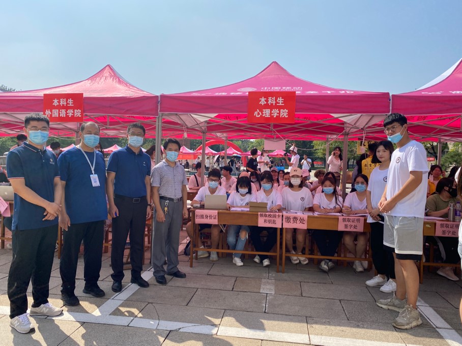 党委书记罗文伟、院长何文广、辅导员赵旭涛、辅导员贺现网走进迎新现场,对新生的到来表示热烈欢迎并检查指导迎新工作的进行。学生会成员引导并帮助新生完成信息录入、宿舍分配、搬运行李等报到流程,使新生倍感温馨。