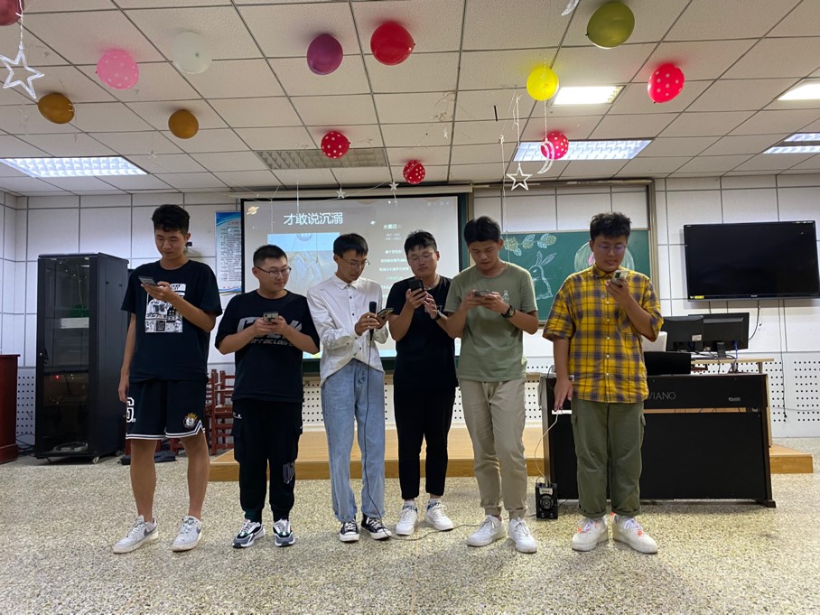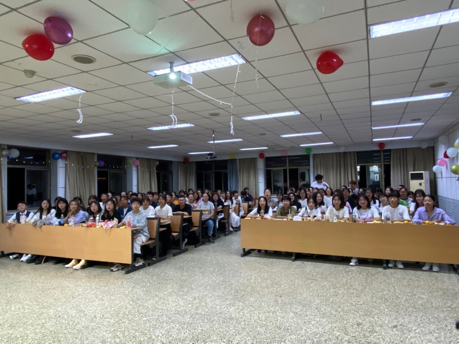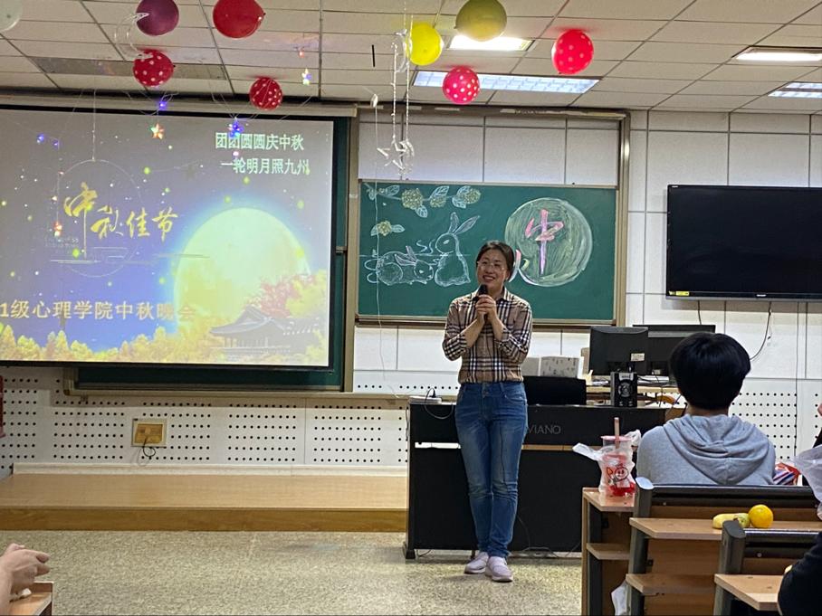 2021级学生齐聚院楼415教室参加中秋联欢晚会。2021级辅导员朱伟卫副书记和同学们一起共度佳节。