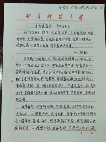 的同学们纷纷投稿,将伟大的爱国主义精神赋予纸笔之间,写下一篇篇饱含热情的文章。经过评委的认真评选,最终,刘欣乐同学荣获一等奖;王春婷、康文元、陈金凤同学荣获二等奖;宋晓琴、王志玲、李艳瑾、邬佳钰、张真同学荣获三等奖。