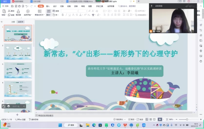 此外,社区居委会对居民的心理健康状况尤为关注。在疫情放开化管理这个大背景下,不少居民都会出现恐慌不安,焦虑烦躁的心理。针对这种情况,实践成员跟随工作人员来到社区的心理驿站,发挥自身专业知识,与心理驿站的专业人员一起对如何缓解居民的心理状况进行讨论。最后,实践成员将讨论结果整理成幻灯片,以线上心理疏导员的身份与工作人员共同进行线上疏导。疏导内容主要是对有需要的居民进行心理咨询,推荐一些令人感到轻松愉悦的影视和音乐,结合心理学知识对“幻阳”症状进行解读以及给出在疫情期间如何调节自己心理情绪的建议,一起为居民的心理健康站好岗。