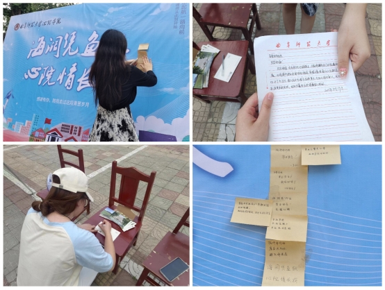 院楼前领取毕业季专属明信片或便利贴,写下想对即将离开校园的师哥师姐说的话,以留言方式为师哥师姐带去祝福,留下专属回忆。师哥师姐们可以在抽取毕业寄语的同时,写下所感所想,鼓励在校师弟师妹不负青春,不负时代。展板上贴满了同学们的寄语,一句句简单而平凡的话传递着心院学子之间深深的祝福之情。