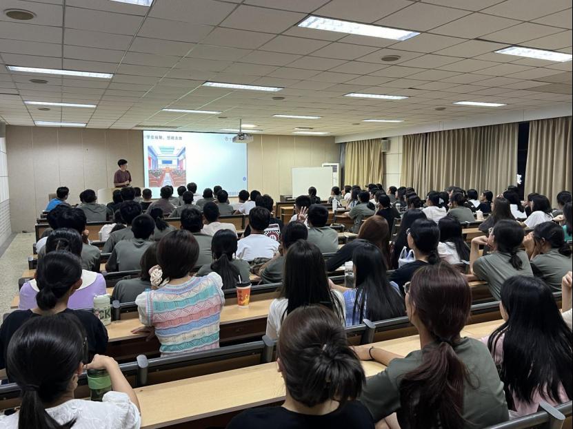 于415教室举办2024级新生朋辈经验交流会,2022级研究生陈银燕、2023级研究生胡晓涵开展分享,2024级全体本科生积极参与。