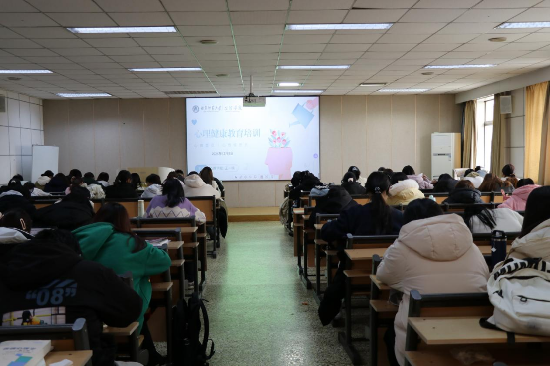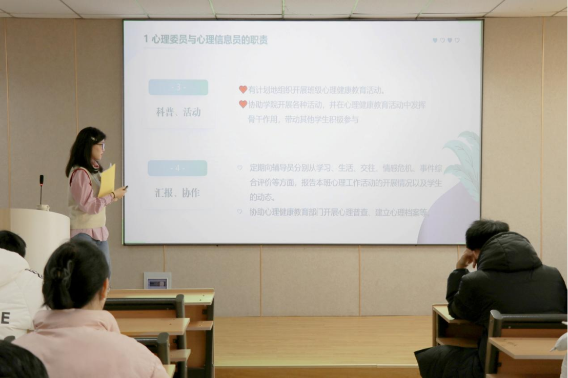 于415室召开了2024年秋季学期心理委员与心理信息员培训大会。本次培训会由学院团委学生会心理健康服务与权益部承办,学院心理辅导员钱虹主持,应用心理专业研究生王一楠主讲,学院全体心理委员和心理信息员共八十余人积极参与。