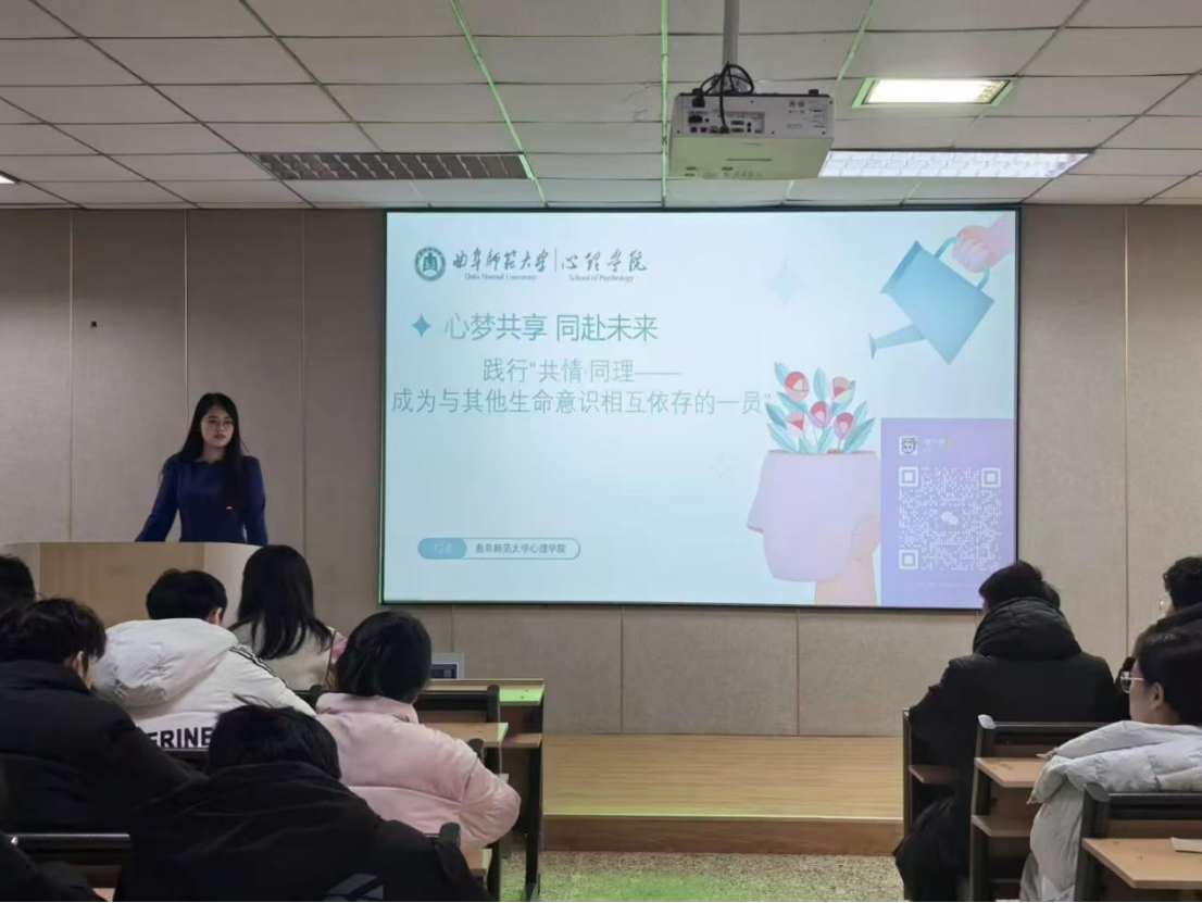 在讲解过程中,王一楠结合个人经验与参会成员开展答疑交流,采用互助分享和发放纸条等互动方式,为同学们提供分享内心的困惑的机会,并用专业知识为其答疑解惑。随后,王一楠向同学们推荐多个专业学习平台与资源,鼓励大家充分利用、积极学习,从而不断提升自身的专业能力。在讲解最后,她引用“共情·同理——成为与其他生命意识相互依存的一员”作为结束语,表达了对各位心理委员和心理信息员未来工作的鼓励与期许。