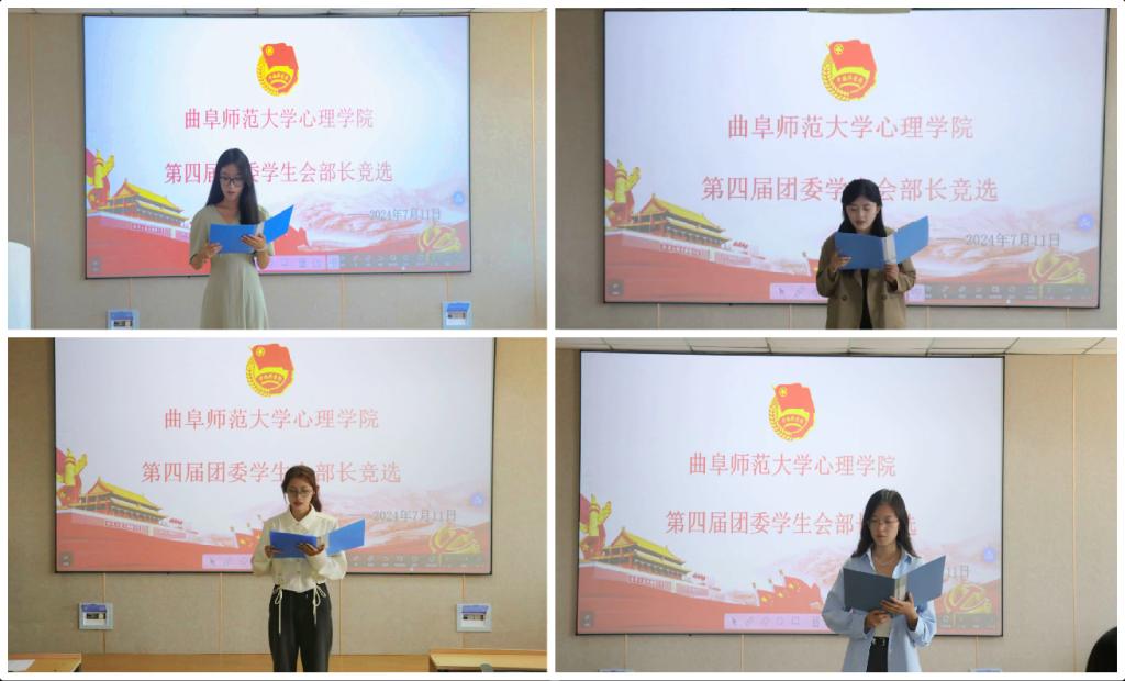 于415室召开第四届团委学生会主席团、部长竞选大会。心理学院党委副书记、2021级辅导员朱伟卫,团委书记、2023级辅导员贺现网,2022级辅导员钱虹、学生会学生干部代表出席会议。本次会议由秘书处副秘书长李柯妤、张欣主持。