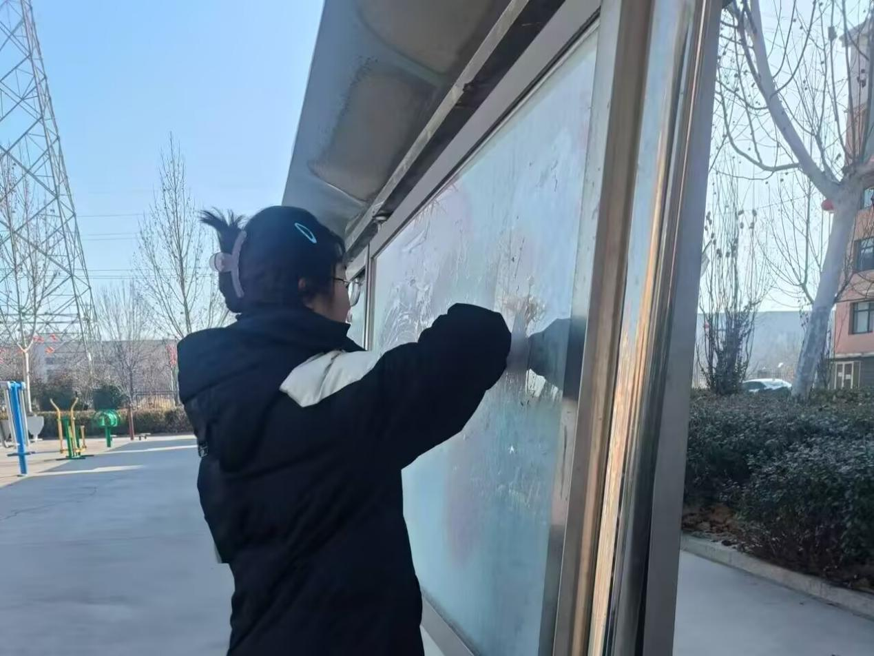 “红心筑梦践基层,多元共融启新程”社会实践队员在擦拭公告栏
