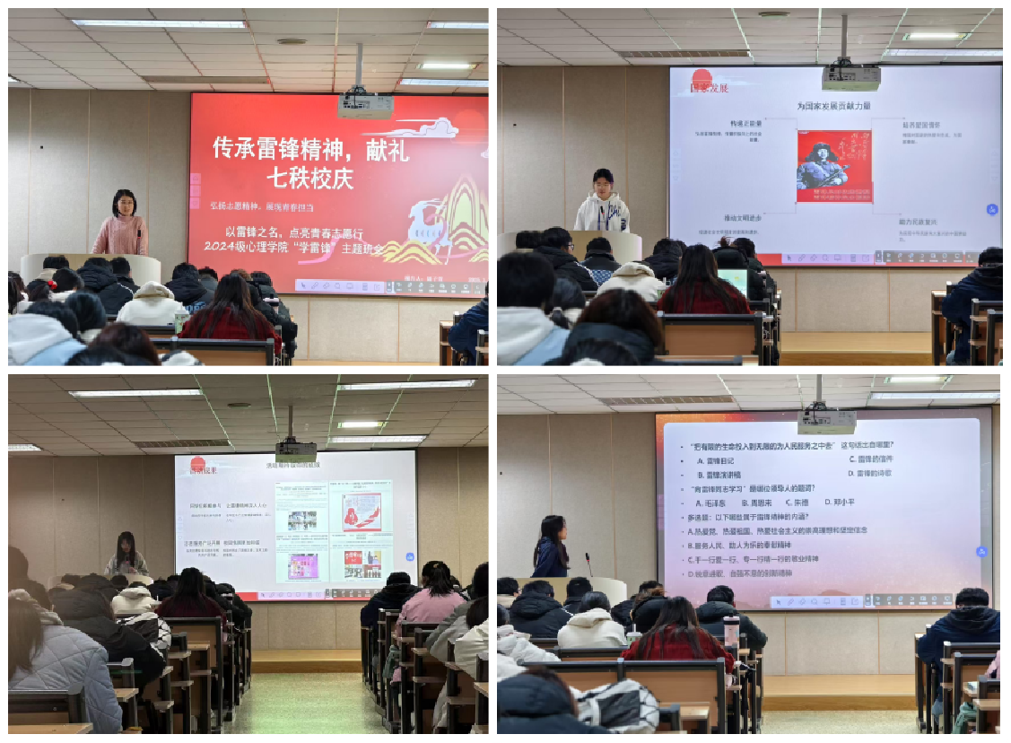 24级心理学一班团支书牛雨晴同学开展趣味答题活动,通过互动式学习,引领同学们进行小组讨论,巩固班会学习成果。此举激发了大家的学习热情,同时深化了大家对于雷锋精神相关知识的理解,培养了团结协作的精神。