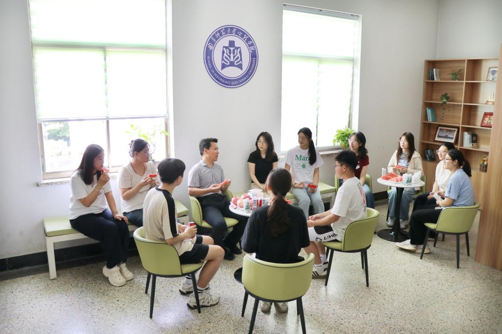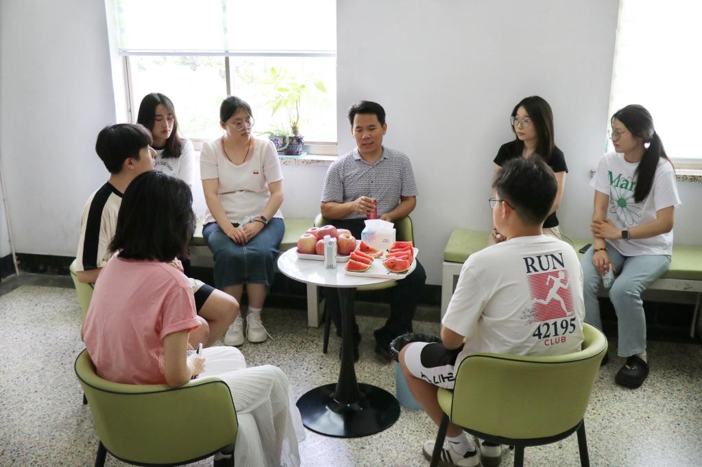 于6月18日举办“书记院长下午茶”第一期暨2025届毕业生代表座谈会。学院院长何文广与即将毕业的心院学子围坐畅谈,以清甜瓜果寄寓人生甘美,用真挚嘱托照亮前行征途。