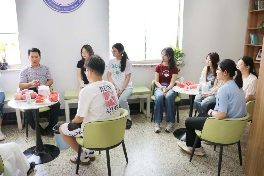 座谈会伊始,何文广一改往日讲台上的严肃,他亲手为毕业生递上切好的西瓜,笑言:“这西瓜红瓤黑籽,恰似你们在心院的四年——红火的是青春,沉淀的是专业根基。”大家端起牛奶共同举杯,共话心理学人的使命——“既要保持科研的严谨,更要永葆助人的温情”。觥筹交错间,往日课堂上的理论争鸣化作此刻的温情流淌,窗外火热的阳光凝成眼底的不舍星光。