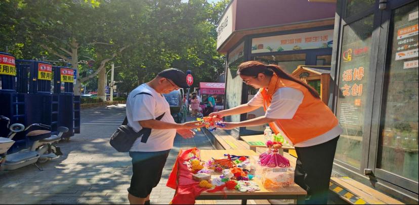 “融心筑社”实践队队员在山东省淄博市张店区八大局便民市场南门开展“珠联璧合·爱心助学”公益助残义卖活动。此次实践活动旨在通过设计制作融合淄博文化元素的手工串珠DIY作品,实现文化创意与公益助残的深度融合,为特殊教育群体搭建融入社会的桥梁,传递社会关爱与温暖,同时推动文化传承与创新发展。