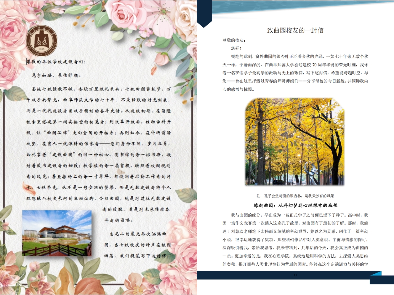 本科生纷纷致信校建设者,争先讲述曲师大70周年校庆与学校发展,更有学生附上曲园照片加以展示。截至作品征集结束,PODO漫画
