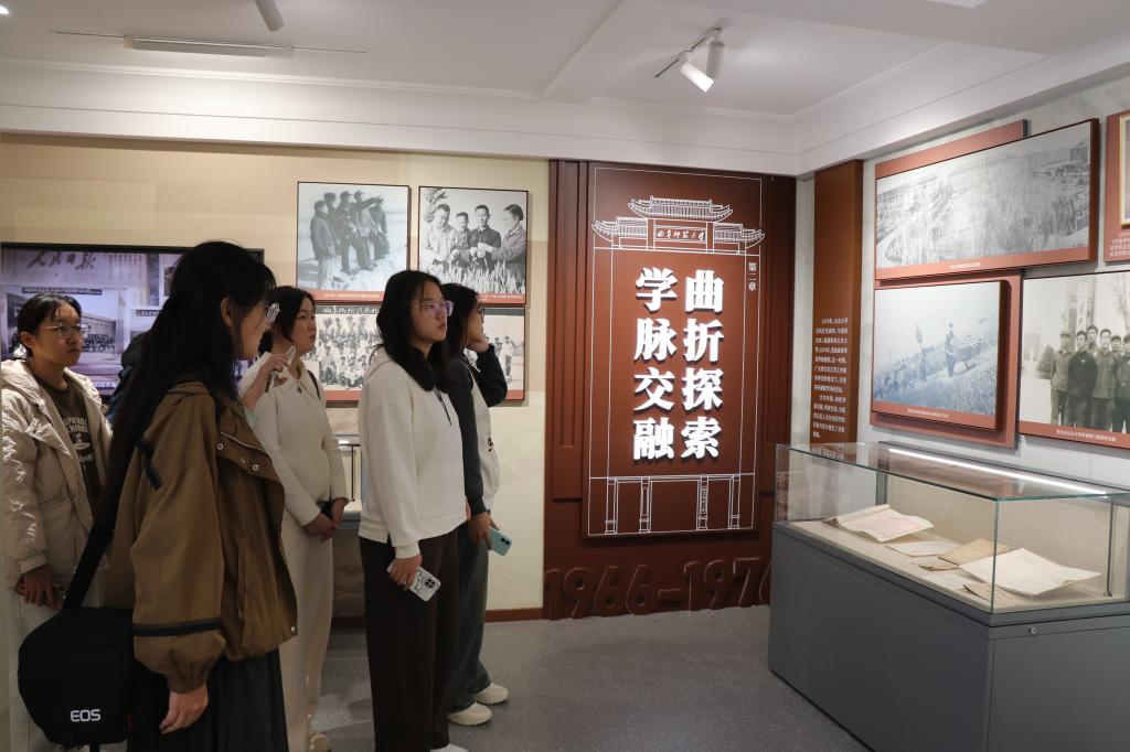 在校史馆讲解员的耐心引导下,同学们有序地步入馆内,按照既定的参观路线,逐一参观了三个展厅。第一展厅主要以图片与文字相结合的形式展现了我校七十年来的办学成就,讲解员带领同学们回顾了我校发展的七个阶段,从建校初期的艰难探索,到逐步发展壮大的稳步前行,再到如今在多个领域取得卓越成绩的辉煌时刻,同学们驻足每一幅图片、每一段文字前,认真聆听讲解,感叹曲园七十周年路程的艰辛与不易;第二展厅主要播放我校自建校以来的珍贵影像资料,包括校庆宣传片等,影像中,一幕幕熟悉的校园场景、一场场精彩的活动画面,仿佛将同学们带回到了过去的时光。大家聚精会神地观看,时而露出会心的微笑,时而为学校的辉煌成就而鼓掌。第三展厅通过场景与实物还原的方式展现了我校辉煌的办学历史。同学们近距离观看老教材、浮雕墙等,仿佛穿越时空,回到了那段峥嵘岁月。老教材上工整的笔记、浮雕墙上栩栩如生的人物形象,都诉说着学校曾经的奋斗与辉煌。校史馆的每一件陈列的展品,都仿佛是历史的见证者,承载着一个个感人至深的奋斗故事;每一块精心设计的展板,都如同时间的书页,书写着一段段令人敬仰的光辉传奇。