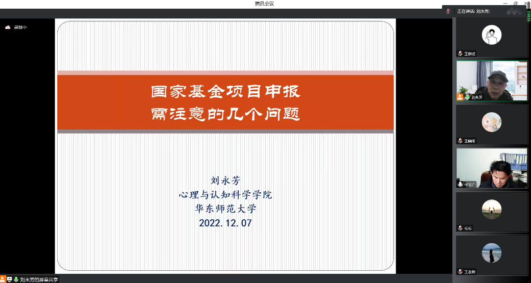 讯(通讯员:王修欣 摄影:王修欣)2022年12月7号下午,我院邀请了华东师范大学心理与认知科学学院刘永芳教授,通过线上平台腾讯会议作国家级项目申报辅导与选题论证。此项活动吸引了学院、校内外教师与研究生近100余人参与。活动由何文广院长主持。