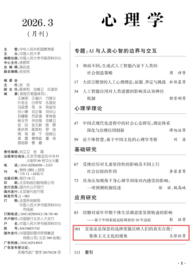 近日,我院王修欣副教授、李朝旭教授与硕士研究生胡晓涵、刘洁和孙凤阳,刊发的文章《直觉还是深思的选择更能反映人们的真实自我?集体主义文化的视角》被中国人民大学书报资料中心《复印报刊资料·心理学》2026年第3期全文转载。该文章原载于《心理技术与应用》2025年第12期。