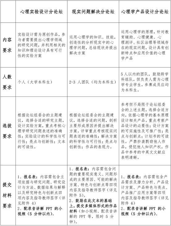 本论坛涵盖心理实验设计、现实问题解决及心理学产品设计等三个分论坛,各论坛要求见下表,作品主题建议及内容要求见附件二《关于举办全国高校心理学专业本科生创新创业论坛的通知》。