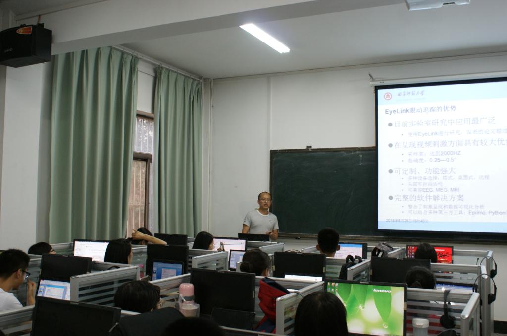 第三届大学生实验技能大赛。5月26日,学院于实验实训中心团体测评室和阅读实验室举办实验技能竞赛培训活动。本次培训包括实验设计与数据处理、E-prime编程和眼动实验三个项目,分上午、下午和晚上三个时段进行,来自2015和2016级心理学、教育学、小学教育和学前教育四个专业66名本科生和多名研究生参加此次培训。